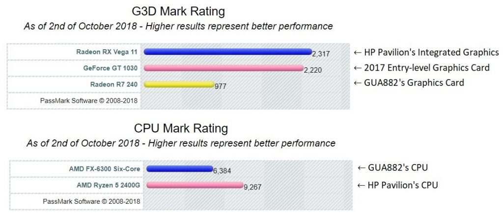 If you’re seeking better performance for the money and are willing to sacrifice looks, we’d recommend checking out something like the HP Pavilion Desktop Computer. Although it doesn’t look like much, it has a better processor and the integrated graphics on this PC outperform both the FX-6300 and the R7 240 by a decent amount.We’d guess that gaming performance from this PC out of the box would be similar if not better than the GUA882 (especially with some extra RAM put into it).