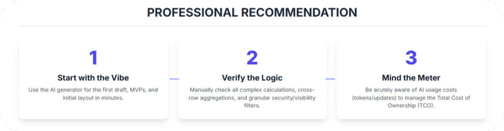 Its “vibe coding” capabilities—the ability to generate entire features from natural language—are highly efficient for prototypes and simple apps. However, its reliance on data structure and the inherent limitations of AI demand a sharp learning curve for truly complex, enterprise-grade solutions.