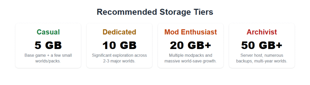 | Casual/New Player | 5 GB | Enough for the base game, a few small worlds, and one or two resource packs. |