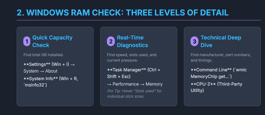 Windows 10 provides several built-in methods to check your RAM specifications, each offering different levels of detail.