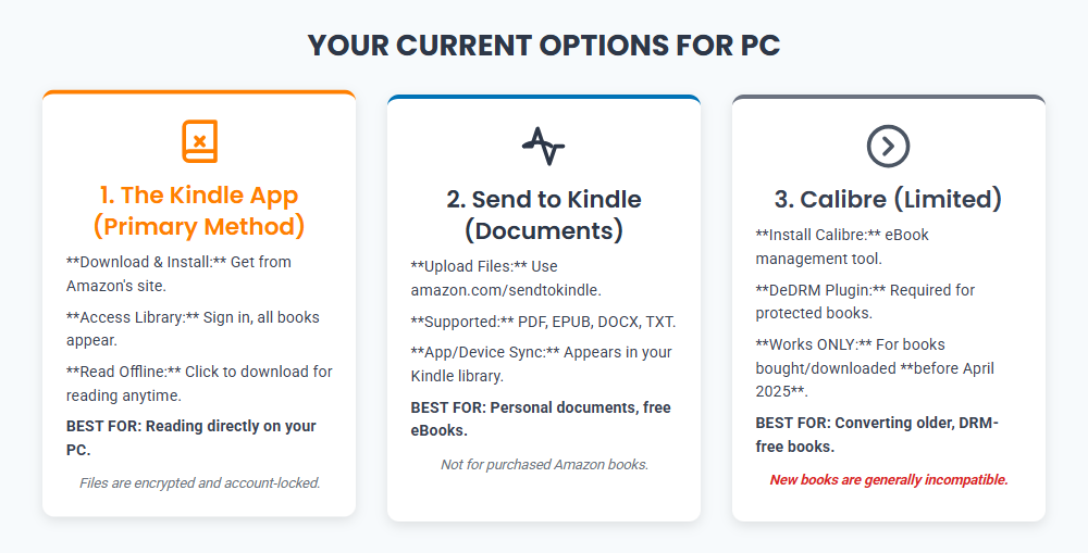 As of October 2025, the best way to download and read Kindle books on your PC is through the official Kindle app. While Amazon has removed the option to download books for manual backup or conversion, you can still access your library, read offline, and manage your collection within the app. For personal documents and free eBooks, “Send to Kindle” remains a useful tool. If you have older books downloaded before February 2025, you may still be able to use Calibre for conversion and backup, but this is increasingly limited. Always keep your Kindle app updated and back up your account credentials to ensure access to your library.