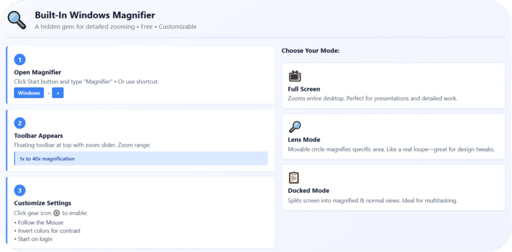 Windows’ Magnifier is a hidden gem for detailed zooming—think of it as a digital magnifying glass. It’s free, accessible, and customizable. To open it: