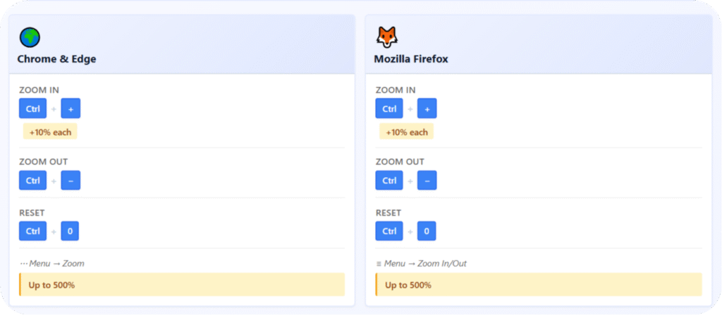 - Google Chrome or Microsoft Edge: Press Ctrl + Plus (+) to zoom in by 10% each time (up to 500%). Use Ctrl + Minus (-) to shrink, and Ctrl + 0 to reset. For menu access, click the three dots (top-right) > Zoom.
