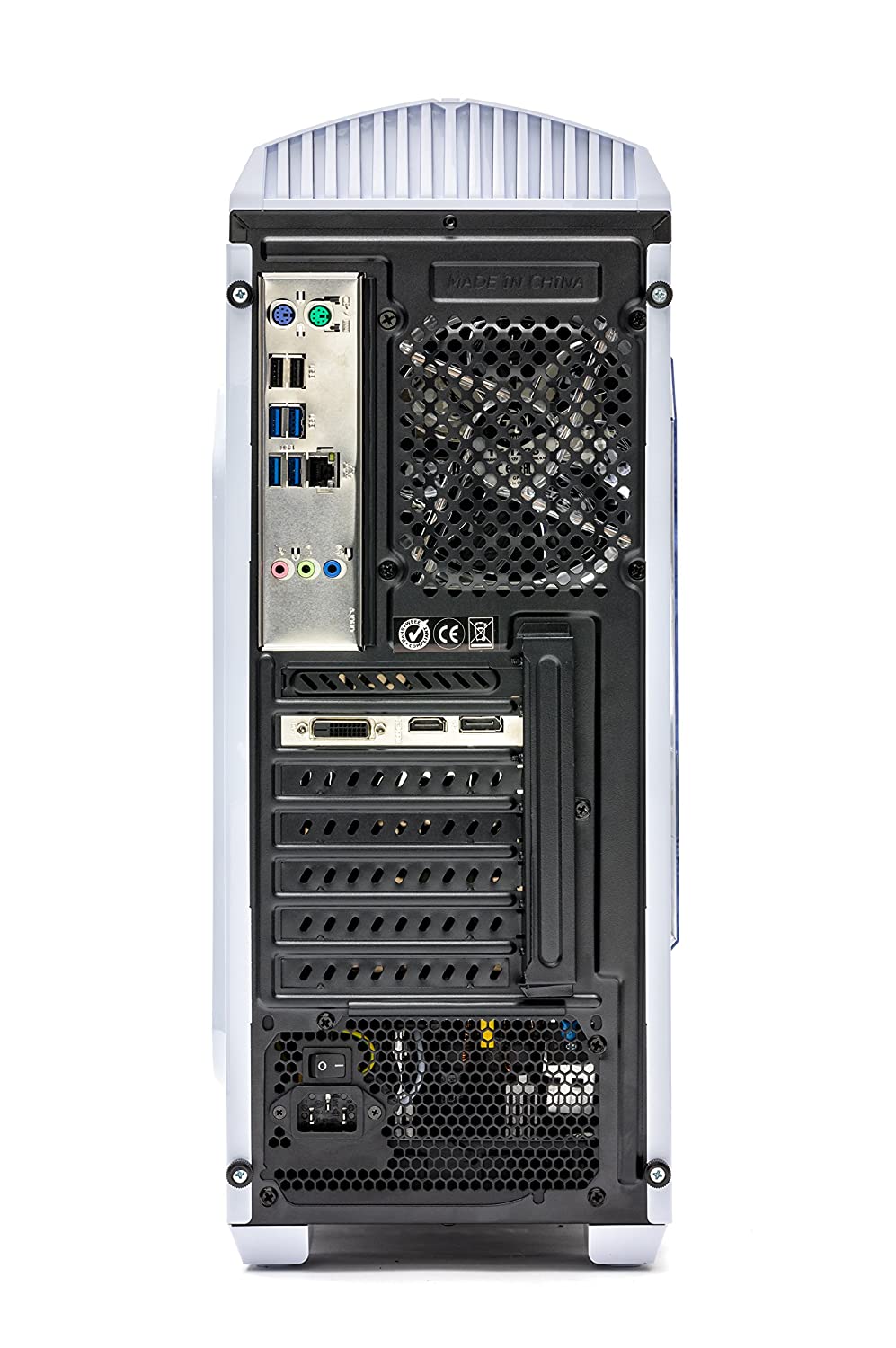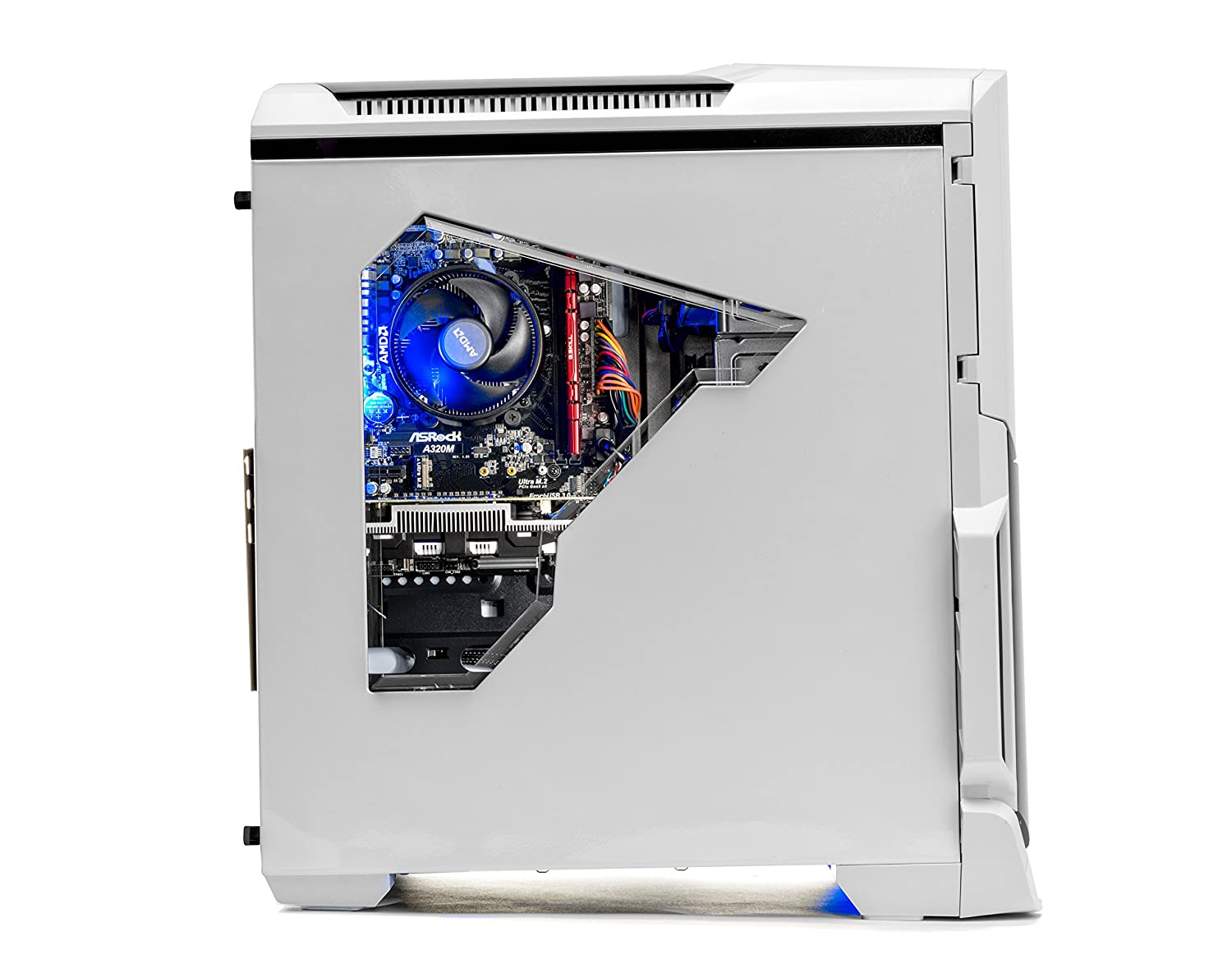 The snow-white case and blue-LED highlights of the SkyTech ArchAngel make it instantly recognizable as a gamer’s PC, and it comes complete with LED-lit gaming mouse and keyboard, wireless adapter, and Windows 10 Home 64-bit operating system. This ArchAngel has current hardware that can handle modern game titles with ease, with the Ryzen 3 1200 processor and GTX 1050 Ti 4GB graphics card.