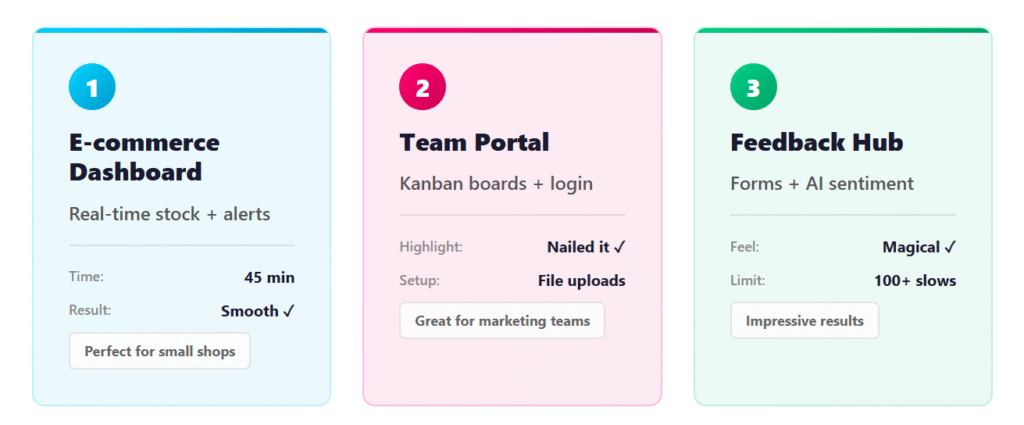 - Team Collaboration Portal: For a marketing team, I asked for task lists linked to Airtable projects. It nailed kanban boards and user logins. Personal tweak: Customized colors to match branding. Downside: File uploads needed extra config.
