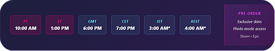 Why this time? It’s a nod to weekend warriors like us who want to jump in without work interruptions. Pre-orders are live now on Steam and Epic, with bonuses like exclusive skins and early access to the photo mode. If you’re in a different time zone, here’s a quick conversion table to keep things simple: