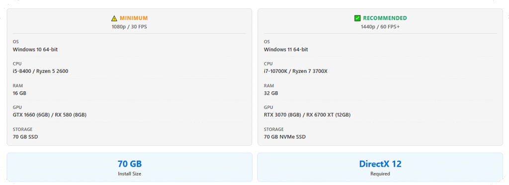 On minimum specs, you’ll run at 1080p/30 FPS with medium settings—playable, but not ideal for intense sequences. Recommended gets you 1440p/60 FPS with highs cranked up. I tested a similar setup on a friend’s rig last week during the beta, and it was smooth sailing.