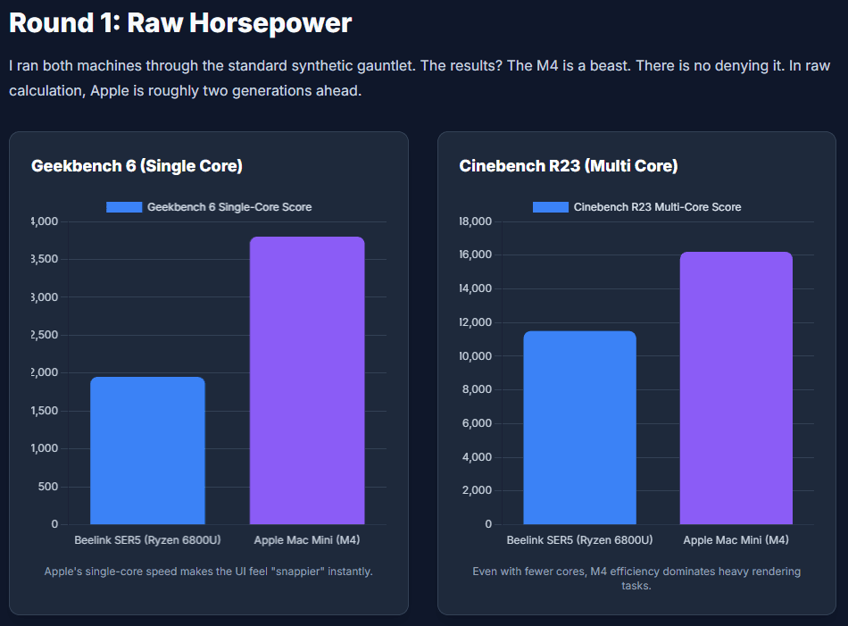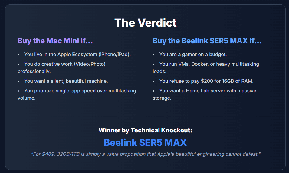 To match the Beelink’s specs on a Mac, you’d have to spend $1,399. That’s not a premium; that’s market segmentation enforced by hardware locks. So, we are ignoring the $1,400 Mac. We are looking at what $500 actually buys you.