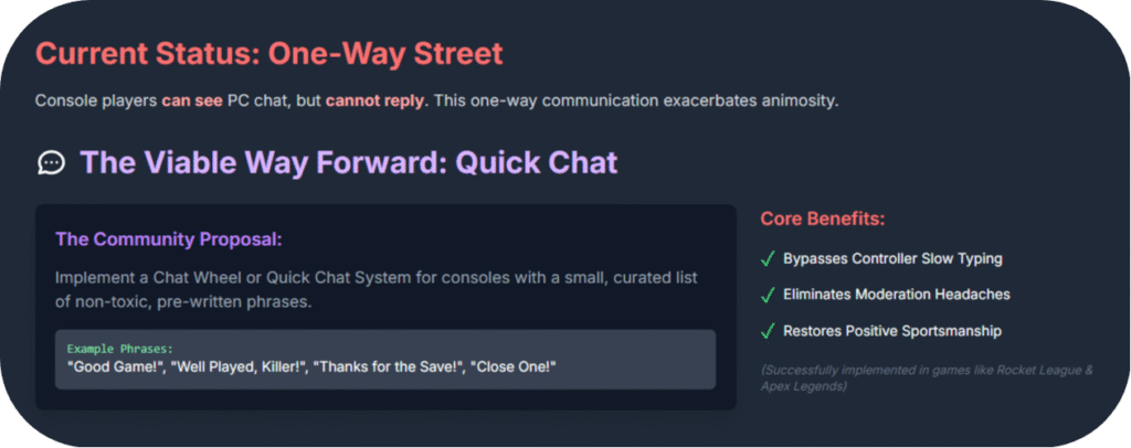 • The Proposal: Add a feature that allows console players to quickly select from a small, curated list of pre-written, non-toxic phrases.