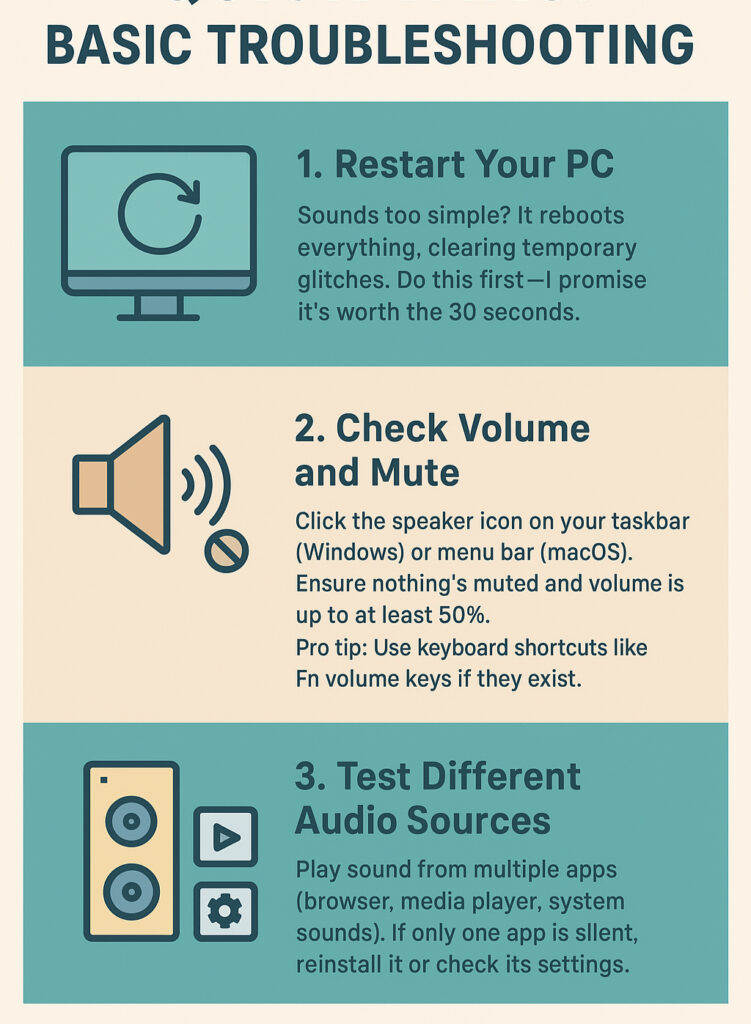 Now, let’s roll up our sleeves. I’ll guide you through fixes from easiest to more advanced. Follow along, and test sound after each step (play a YouTube video or system beep).